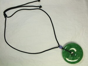 最長紐周:約630mm トップ石サイズ:直径52×厚14mm 重さ:83.4g ●緑色が綺麗なミャンマー翡翠。紐の長さは最長サイズまで調節可能です。 ●「平安」とは中国では旅人のお守りです。勿論普段でも持ち...