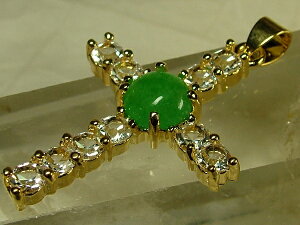×厚6mm 翡翠直径:約8mm 重さ:4.4g ●緑色が綺麗なミャンマー翡翠。インパクト充分な輝きの十字架型ペンダントトップです。金具は合金、ダイヤ状小粒石はキュービックジルコニア、翡翠はトリートメント