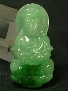 サイズ:47×25×厚10mm 重さ:17.9g ●緑色が綺麗なミャンマー翡翠。縁起柄の観音様が彫り込まれています。石コレクションやお守りに。上部に貫通穴が有るのでペンダントトップや下げ飾りにもなります...