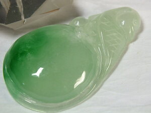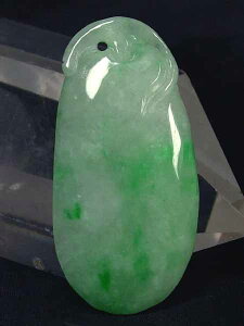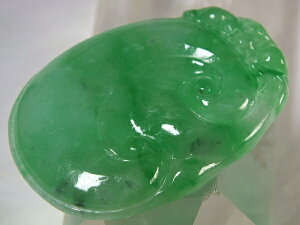 サイズ:60×40×10mm 重さ:39.4g ●緑色が綺麗なミャンマー翡翠。透明感の有る氷種(アイスジェダイト)です。縁起柄の鯉が彫り込まれています。石コレクションやお守りに。上部に貫通穴が有るの...