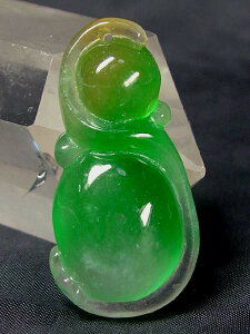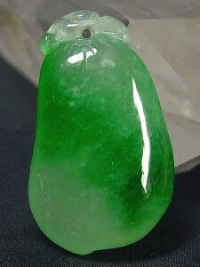 サイズ:30×16×厚5mm 重さ:4.6g ●緑色が綺麗なミャンマー翡翠。透明感の有る氷種(アイスジェダイト)です。縁起柄の瓢箪が彫り込まれています。上部に貫通穴が有ります。ペンダントトップや下げ飾り等に...