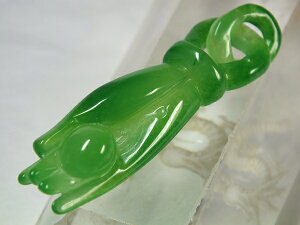 サイズ:54×43×厚6mm 重さ:21.9g 緑色が綺麗なミャンマー翡翠。こちらはかなり透明感の有る「氷種」です。縁起柄の如意が彫り込まれています。上部に貫通穴が有ります。ペンダントトップや下げ飾り等に...