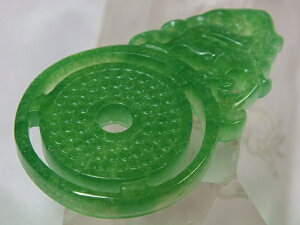 サイズ:51×31×厚6mm 重さ:12.2g ●緑色が綺麗なミャンマー翡翠。透明感の有る氷種(アイスジェダイト)です。上部に縁起柄の貔貅(ひきゅう)が彫り込まれ、透かしも入れられたとても手の込んだ牌子です...