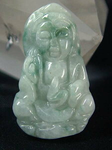 サイズ:42×23×厚4mm 重さ:7.3g 薄緑色が綺麗なミャンマー翡翠。透明感の有る「氷種」です。縁起柄の観音様が彫り込まれています。上部に貫通穴が有ります。ペンダントトップや下げ飾り等に。