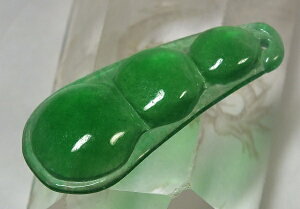 サイズ:44×18×厚6mm 重さ:6.7g ●緑色が綺麗なミャンマー翡翠。透明感の有る氷種(アイスジェダイト)です。縁起柄の莢豆が彫り込まれています。石コレクションやお守りに。上部に貫通穴が有るの...