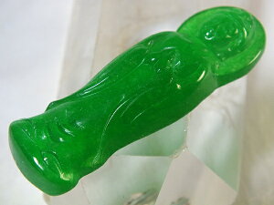 サイズ:51×16×8mm 重さ:9.9g ●緑色が綺麗なミャンマー翡翠。透明感の有る氷種(アイスジェダイト)です。縁起柄の観音様が彫り込まれています。石コレクションやお守りに。上部に貫通穴が有るの...