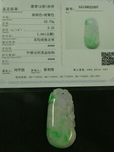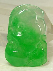 サイズ:38×26×厚8mm 重さ:14.3g ●緑色が綺麗なミャンマー翡翠。こちらは透明感の有る「氷種」です。縁起柄の如意が彫り込まれています。石コレクションやお守りに。上部に貫通穴が有るので下げ飾りにもなります...