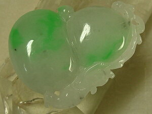 サイズ:49×35×厚6m 重さ:20.8g ●緑色が綺麗なミャンマー翡翠。縁起柄の瓢箪が彫り込まれています。上部に貫通穴が有ります。石コレクションやお守り、ペンダントトップや下げ飾り等に。 ☆商...