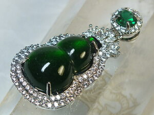 トップサイズ:32×20×厚10mm 翡翠サイズ:21×13mm 重さ:8g ●緑色が綺麗なミャンマー翡翠。瓢箪型の可愛いペンダントトップ。周囲の小粒石はキュービックジルコニアです。金具付きなのでチェ...