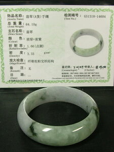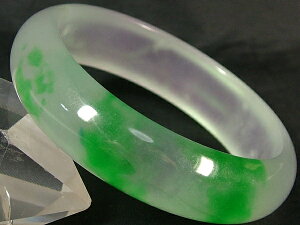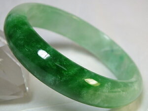 重さ:63.7g ●緑色が綺麗なミャンマー翡翠。透明感の有る氷種です。飾り彫りのないシンプルなデザインですが、微妙に濃淡が場所によって違う、飽きのこないバングルです。 ●中国では翡翠の腕
