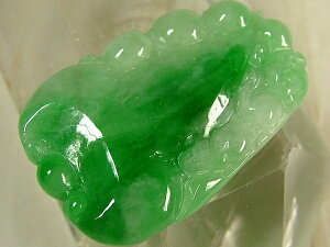 サイズ:34×22×厚6mm 重さ:8.6g ●緑色が綺麗なミャンマー翡翠。縁起柄の如意が彫り込まれています。上部に貫通穴が有ります。ペンダントトップや下げ飾り等に。