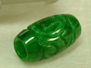 サイズ:長17×直径10mm 穴直径:約3mm 重さ:2.5g ●緑色が綺麗なミャンマー翡翠。周囲に双銭柄が彫り込まれた樽型の管玉です。オリジナルアクセサリー作り等に。
