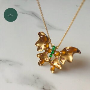 ミャンマー産透明感抜群なオレンジとグリーンのルースを使っており、ドロップ型のオレンジルースと銅の色味がヴィンテージ感を出しており希少な一点