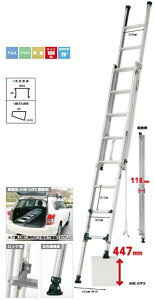 収納長(m):2.77●質量(kg):12.4《特長》●軽量・コンパクト仕様で持ち運びにも便利です。●伸縮脚付で段差があっても設置可能な2連はしごです。