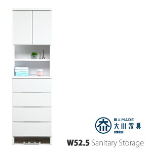 商品詳細 清潔感のある52.5cm幅、白色のサニタリー収納 下部にはヘルスメーターやルンバを収納しやすいオープンスペースあり 扉は開閉楽々なプッシュ式 引き出しはストッパ付きで落下防止 棚板は可動棚で高さ調整可能 便利な2口コンセント