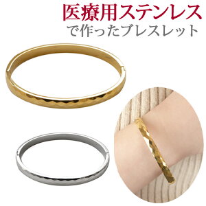 槌目加工が上品なバングル 一周ぐるりと槌目加工が施されており 落ち着きのある上品なデザインです。シンプルで服装を選ばずお使いいただけます。着けっぱなしにしていたり汗をかいても痒くならない、サージカルステンレス製。