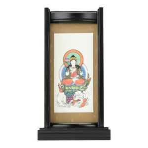 モダン仏壇にオススメの掛け軸 深み有る色合い上品でモダン仏壇に人気。 本紙絵像の細かな書き込みや裏地が金色で高級感があります。このサイズは主に上置き用サイズ [サイズ]縦210×軸先巾104ミリ(多少誤差があります)※通常の掛軸