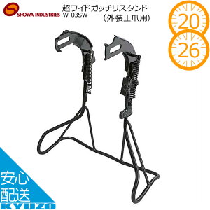 商品名超ワイドガッチリスタンド(外装正爪用) メーカー昭和インダストリーズ 素材スチール 加工クロムメッキ サイズ20インチ用 22インチ用 24インチ用 26インチ用 27インチ用 特徴・お子様を乗せていたり、重い荷物を載せていて
