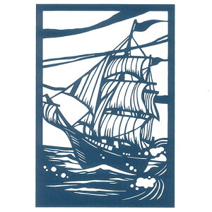 光が当たるとキラキラ煌めく青い紙の切り絵! 有名切り絵作家の作品をあなたも作れます!大海原を勢い良く進んでいる船の絵柄。手順は青い絵柄部分を切るだけ!裏返して付属の白い台紙に貼れば完成です!港のある街の写真を背景にするなど