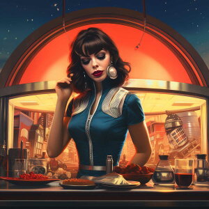 【このポスターについて】 このポスターは、70年代や80年代のアメリカのエッセンスを凝縮したデザインです。モチーフには、活気に満ちた人々の様子、光輝くマッスルカー、そしてレトロなダイナーが取り入れられており、その時代の自由