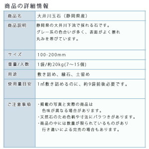 大井川玉石(静岡県産) 商品説明 静岡県の大井川下流で採れる石です。グレー系の色合いが多く、表面がよく擦れ丸みを帯びています。サイズ 200-300mm。重量/入数 1袋/約20kg(2〜3個)。10袋セット/約200kg。用途 敷き...