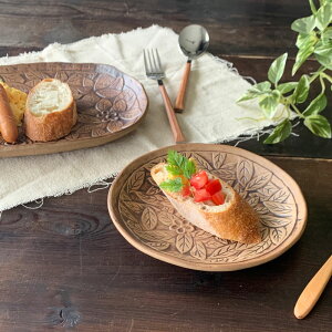 商品につきまして お皿全体に浮かび上がるリーフ模様に、ぷくっと咲くお花が可愛らしいデザインです。 「木彫りのような雰囲気のウッディ」「木もれ日を感じる均窯スカイ」の大人っぽい2カラーと楕円皿と丸皿の2サイズを取り揃えてい