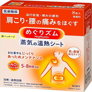 商品名:花王 めぐりズム 蒸気の温熱シート 8枚入内容量:8枚JANコード:4901301236876発売元、製造元、輸入元又は販売元:花王原産国:日本区分:一般医療機器(医療機器届出番号13B3X0...