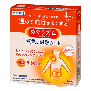 おなかなどに直接貼り、温める医療機器。 ●心地よい蒸気の温熱が、患部を奥まで温めて血行を促進。 ●肩こり・腰痛をほぐします。 ●快適温度約40度が5〜8時間続きます。 ●肌あたりがやさしい蒸気。 ●衣類はぬ