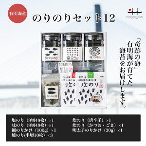 ・名称:のりのりセット12 ・内容量:塩のり(8切48枚)× 1、焼のり(8切48枚)× 1、味のり(8切48枚)× 1、鯛のりかけ × 1、明太子のりかけ × 1 ・賞味期限:180日 ・保存方法:直射日光、高温多湿を避け常温で保存...