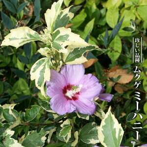 【品種の特徴】ムクゲの中では数少ない斑入り葉の、ダブル咲き品種です。レースのように細やかに波うつ花びらは、綺麗な淡い紫色で、清楚な雰囲気をまとい、見る人を魅了します。葉先、葉の周りから、クリーム色の斑模様が入り...