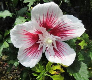 ムクゲ「モーニングサンシャイン」は、夏から秋にかけて花芯が赤く、 桃色の絞りの入った白色の花を次々に開花させる品種です。 1日花のため朝に咲き夕方には萎みます。 ムクゲは色鮮やかで夏に大きな花を咲かせる落葉低木です...