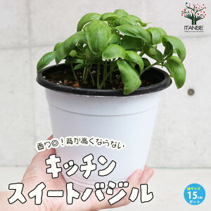 品種:矮性スイートバジル ジェコン キッチン・スイートバジルは、あまり背が高くならない、矮性タイプのスイートバジルの15cmポットの大苗です。 そのまま、キッチン窓辺やベランダなどで省スペース栽培ができるので、いつでも必要な時