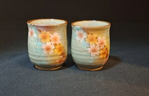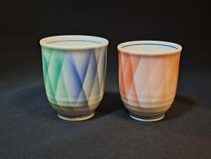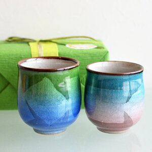 人気の銀彩を九谷独自の五彩をアレンジし、ひとつは淡いグリーンからブルーへ。もう一つはトルコブルーからピンクへとグラデーションを奏でています。 お洒落な現代的九谷焼のご提案です。 お湯呑みは優しいカーブをもった手に馴染み