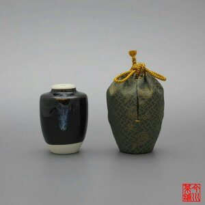 お手頃価格の肩衝茶入です。仕服の表地は正絹です。 仕覆の柄は当店にお任せ下さい。 -------------------------------- ■商品名:京焼 肩衝茶入 ■仕服:緑色系 正絹仕覆 ■蓋:樹脂製 ■紙箱