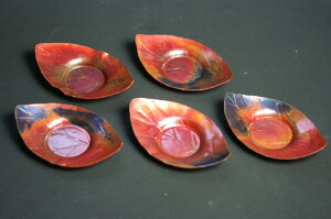 舞い落ちた木の葉のような茶托 銅板を鎚で叩いて制作しています。 作家が一枚一枚、木の葉の形に打ち出し、 表情がそれぞれに少しづつ違っています。 紅色と紫色が美しく重なり合った艶やかな色合いは 銅自体を発色させ求めたものです