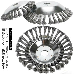 草刈り機の交換用ブラシカッター頑丈なスチールワイヤー製草刈り機の刃と交換するだけで使用できます農薬を使用しないで苔・雑草除去ができますサビ取りやバリ取りなどに使用できる高い汎用性 サイズ 6インチ 8インチ サイズについての