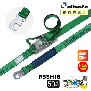 商品特長 ラチェット式により簡単な操作で確実な荷締め作業ができるベルトです。 【スペック】 ■型番:R5SH16 ■商品名:ラッシングベルト ラチェット式スナップフック仕様(重荷重) ■カラー:50G4(緑) ■ラチェット式 ■先端形状:ス