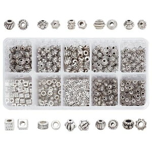 【10種約500個】:10種類(カラム、ロンデル、ランタン、キューブ、バレル、そろばん、花など)のアンティークシルバーシリーズのスペーサービーズが揃っており、また各種が約50個入っており、結構豊富で大...