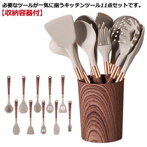 必要なツールが一気に揃うキッチンツール11点セットです。【収納容器付】フライパンを傷つけにくいシリコーン素材。コーティングを傷つけにくく、フライパンも鍋も長持ち。素材のしなやかさで、食材を最後まで残さずすくえます。木目