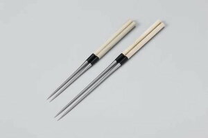 箸です。 ◆和食の盛り付けに欠かせない盛箸(盛り箸)です。 ◆菜箸の一種で、特に盛りつけしやすいよう、先端を細く作ったものです。 ◆真菜箸・金箸とも呼ばれ、魚をさばく時に包丁の補佐