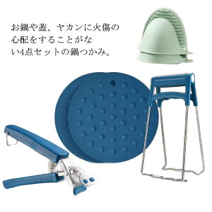 お鍋や蓋、ヤカンに火傷の心配をすることがない4点セットの鍋つかみ。クリップの先端はシリコンで滑りにくく、食器・鍋などを傷つけにくい。ボウルリムーバーは熱い蒸気から手を保護し、ボウルや皿をフォルダーにクリップして、指を熱
