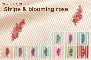 優雅に咲いたバラ模様が上品なカットジャガード生地。バラはジャガードで表現され、柄に立体感が生まれ、プリントとは違う高級感を放っています。ストライプ柄をベースに敷き、上品で優美な生地に仕立てました。バラやストライプは少