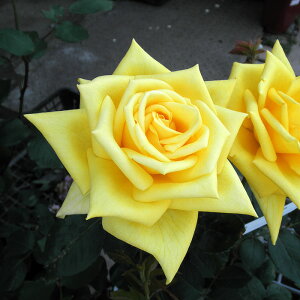 Kouka 花色:黄色香⇒微香花季:四季咲き⇒くり返しよく咲きます 花径:12-13cm 樹高:1.2-1.5m 花色はクリーム黄色、涼しげな秋になると、輝くよ うに鮮やかな純黄色となる。 花径13cm、花びらが先尖る典型的な剣弁高...