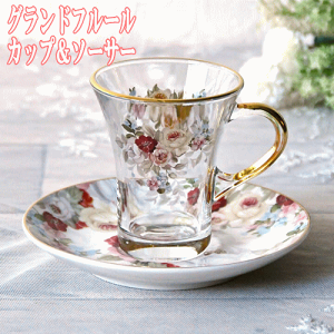 可憐な花々が描かれた美しいガラスのティーカップ。同柄の磁器製ソーサーとセットです。 ホットドリンクも入れられるので、季節を問わずティータイムのおもてなしやアフタヌーンティーのコーディネートに活躍します。 全面にお花がデ