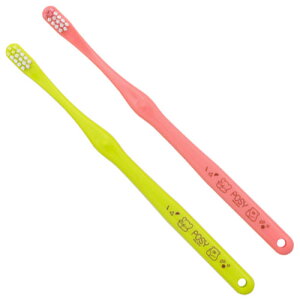 磨き直しに最適な薄型コンパクトヘッドピンポイントで磨けるしっかり毛と、優しく磨けるやわらか毛の2種類の毛を使用しなるハンドルで痛がらない磨き直しに最適な超薄型コンパクトヘッドライムグリーンとコーラルレッドのハンドルカラ