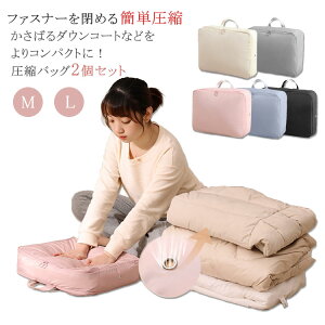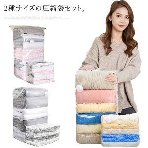 2種サイズの圧縮袋セット。ふとん(掛け、敷き、毛布、まくら)、衣類、ぬいぐるみ等がコンパクトにすっきり収納できます。座るまたは手で押すだけで楽々圧縮できる圧縮袋です。また、掃除機対応で速やかで綺麗に圧縮することもできま