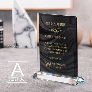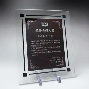 ガラスの表面の文字と裏面の黒を基調としたデザインが美しい表彰盾です。周年記念や社内表彰、取引先表彰、認定証、感謝状などにお勧めです。
