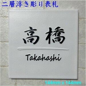 風水的に良いとされる浮き彫りデザインの白い表札 サイズ :144mm×144mm×11mm 材質 :磁器タイル 加工方法 :彫刻(サンドブラストエッチング) 二層浮き彫り表札は、文字部分と模...