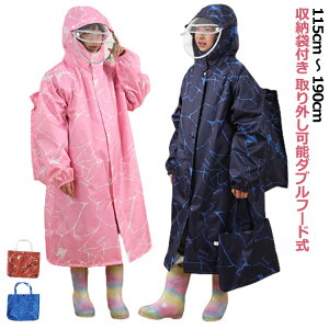 収納袋付き 取り外し可能ダブルフード式フードの広い範囲がクリア素材で作られているから、視界をさえぎらない♪リュックやランドセルを背負ったまま着用できて、とても便利♪袖口は雨の侵入を防ぐゴムテープ入り。多少大き目のサイズ