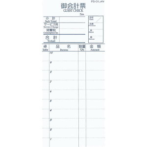 行数は少ないですが、品名欄が大きく、ミシン目を千切りやすい伝票です。■ 基本仕様複写枚数2サイズ(縦x横)195x87mm行数8ページ数2×50ミシン目あり通しNo.なしテーブルNo.なし名様・人様あり担当者...
